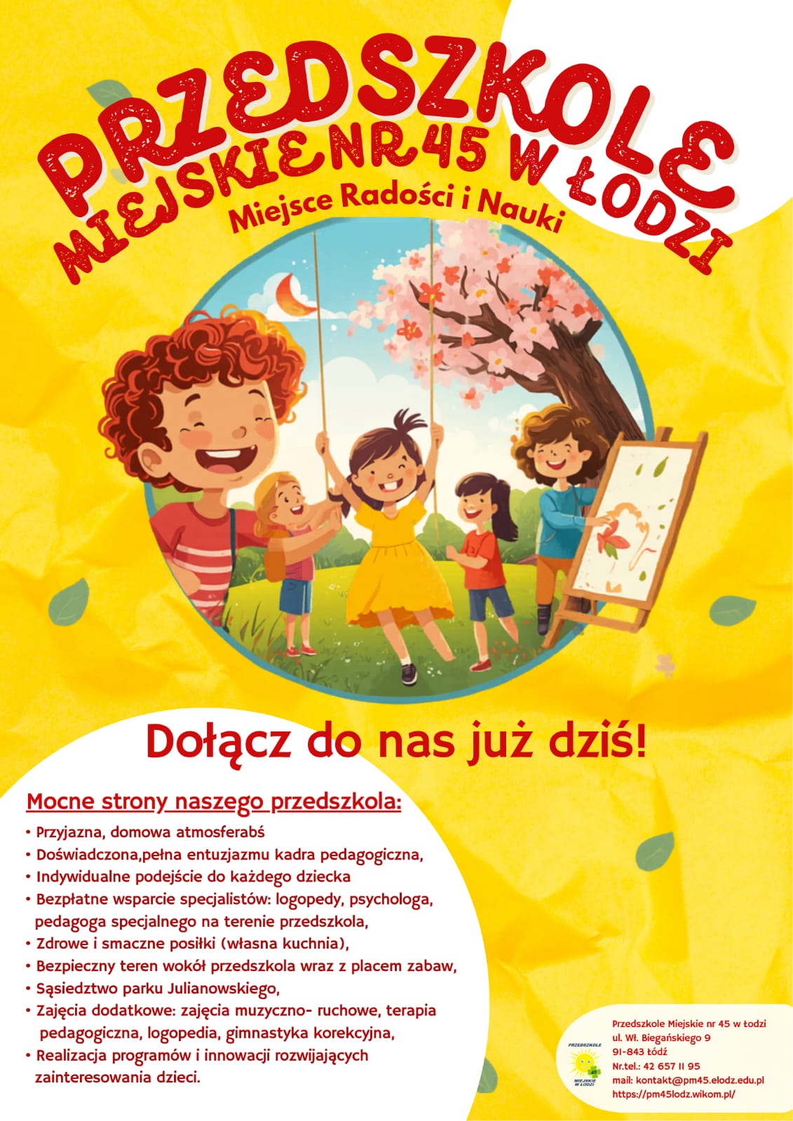 Dyrektor Przedszkola Miejskiego nr 45 w Łodzi informuje, że nabór do przedszkola w roku szkolnym 2026/2027 będzie prowadzony na wolne miejsca w terminie od 01.04.2026 r. do 15.04.2026 r. do godziny 15:00.